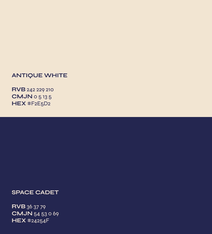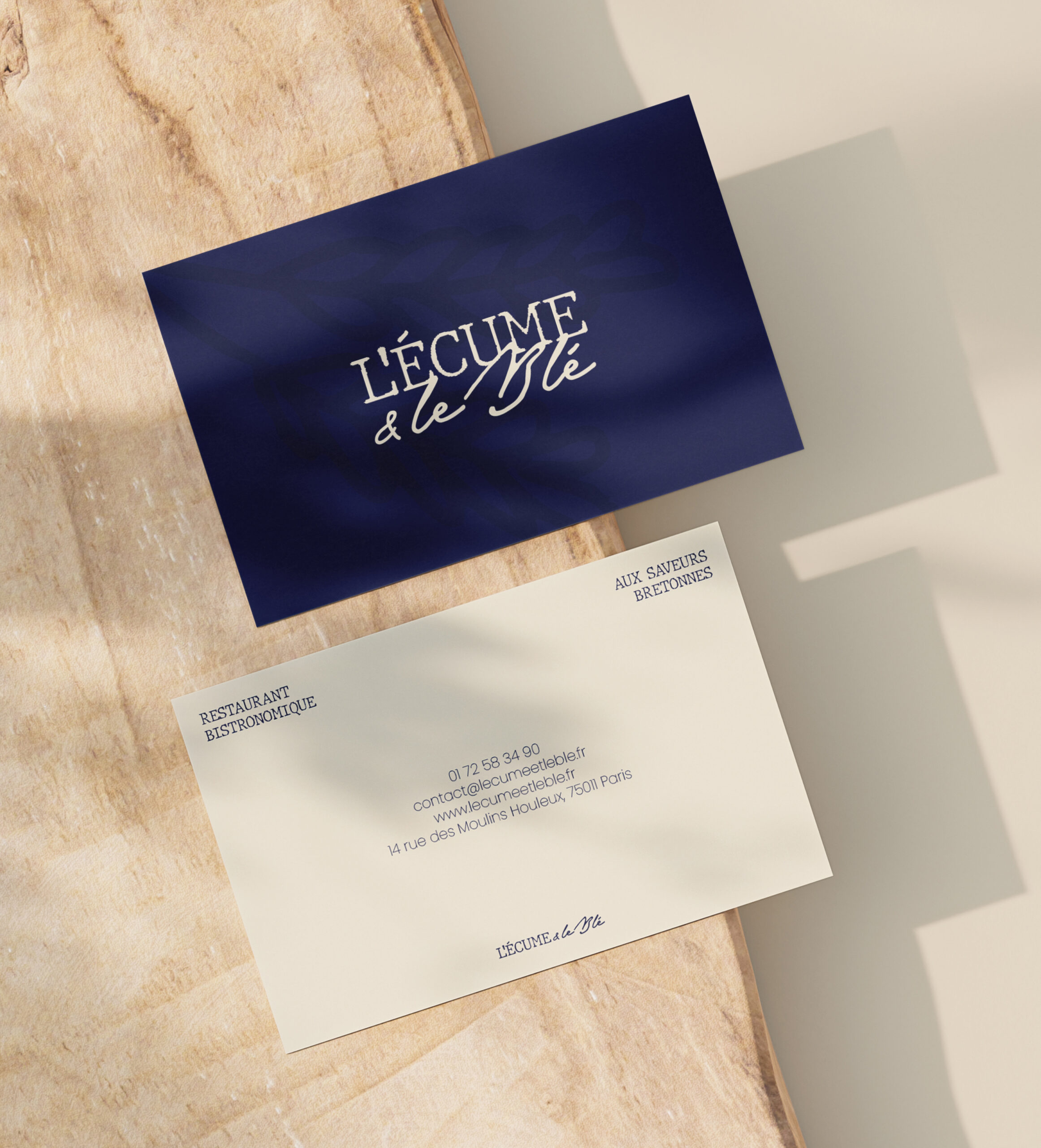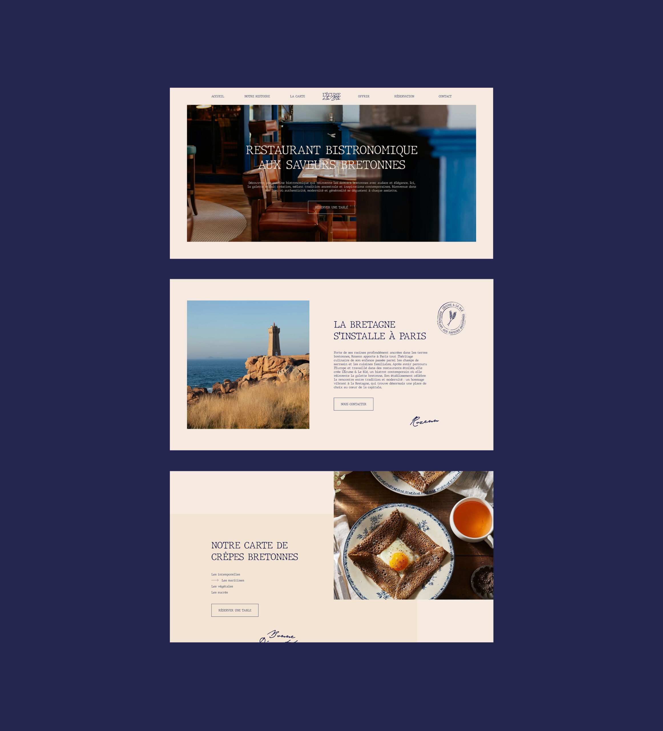 L’identité visuelle traduit l’équilibre entre tradition et modernité. Le duo de couleurs, beige et bleu, évoque les terres bretonnes et l’esprit marin. La typographie machine à écrire installe une touche artisanale, en lien avec les racines familiales. L’écriture manuscrite exprime la créativité et l’audace de la cheffe. L’épi de blé rappelle l’héritage agricole breton et l’ingrédient phare du sarrasin dans la cuisine bretonne.