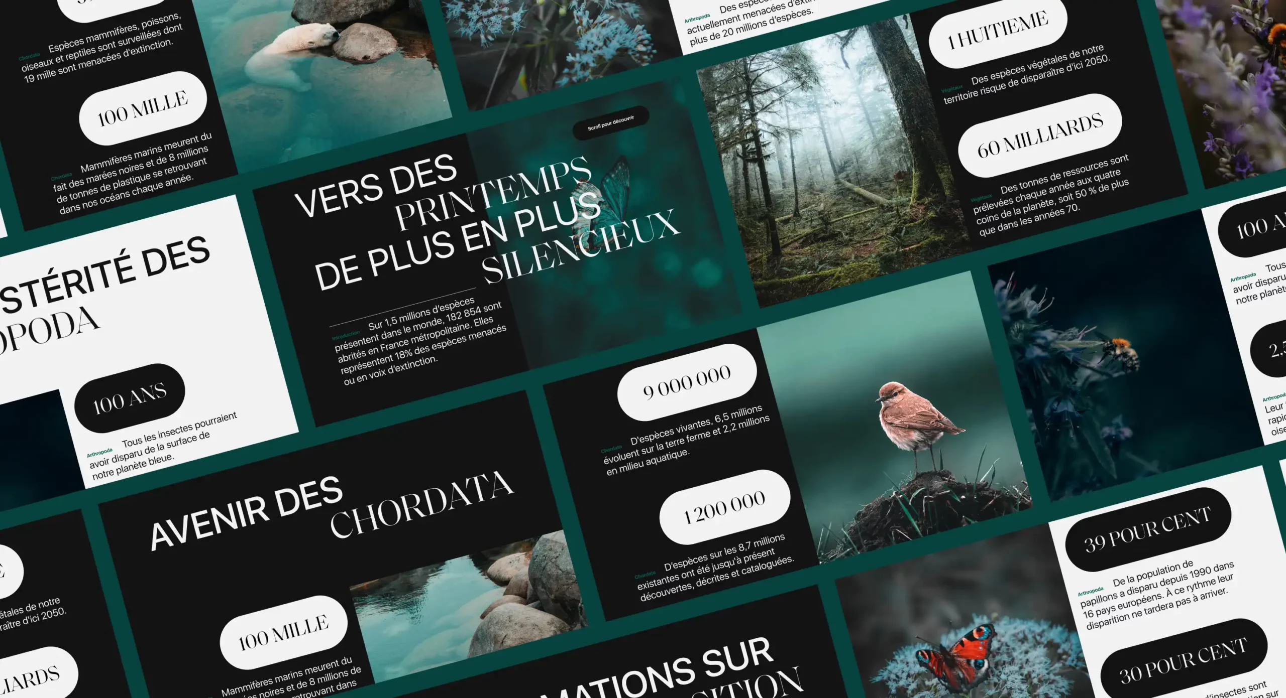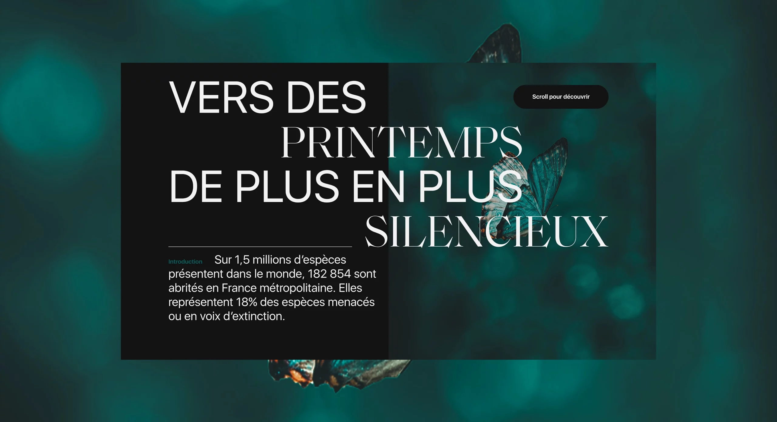 Créer un site one page pour l’exposition temporaire « Vers des printemps de plus en plus silencieux » du Musée d’Histoire Naturelle de Paris.